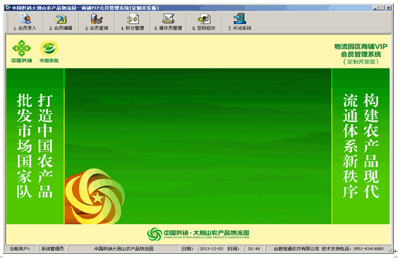 当用户输入正确的用户名和密码登录后即可进入系统主界面,主界面具有6个主模块分别是:会员录入、会员编辑、会员查询、积分管理、操作员管理和密码修改。